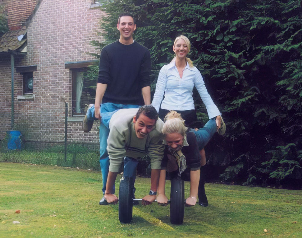 2 sets voor 2 personen. Vorm twee teams, plaats je handen op het wil en de anderen houden je benen vast.